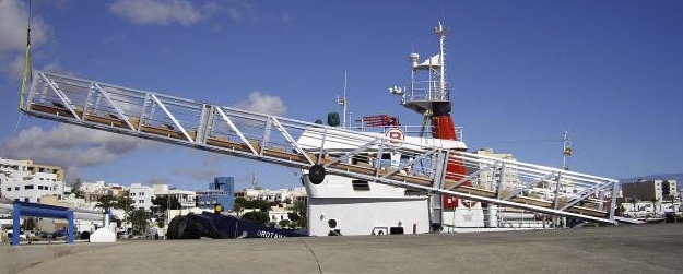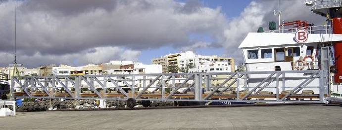 Pasarela de aluminio de 20×1 metros, móvil, para el embarque y desembarque de pasajeros en el Puerto de Las Palmas de Gran Canaria. La pasarela está totalmente construida con aluminio de calidad marina. Estructuralmente funciona como una viga Pratt con arriostramientos horizontales contra el viento. El acabado del pavimento es de madera tropical.